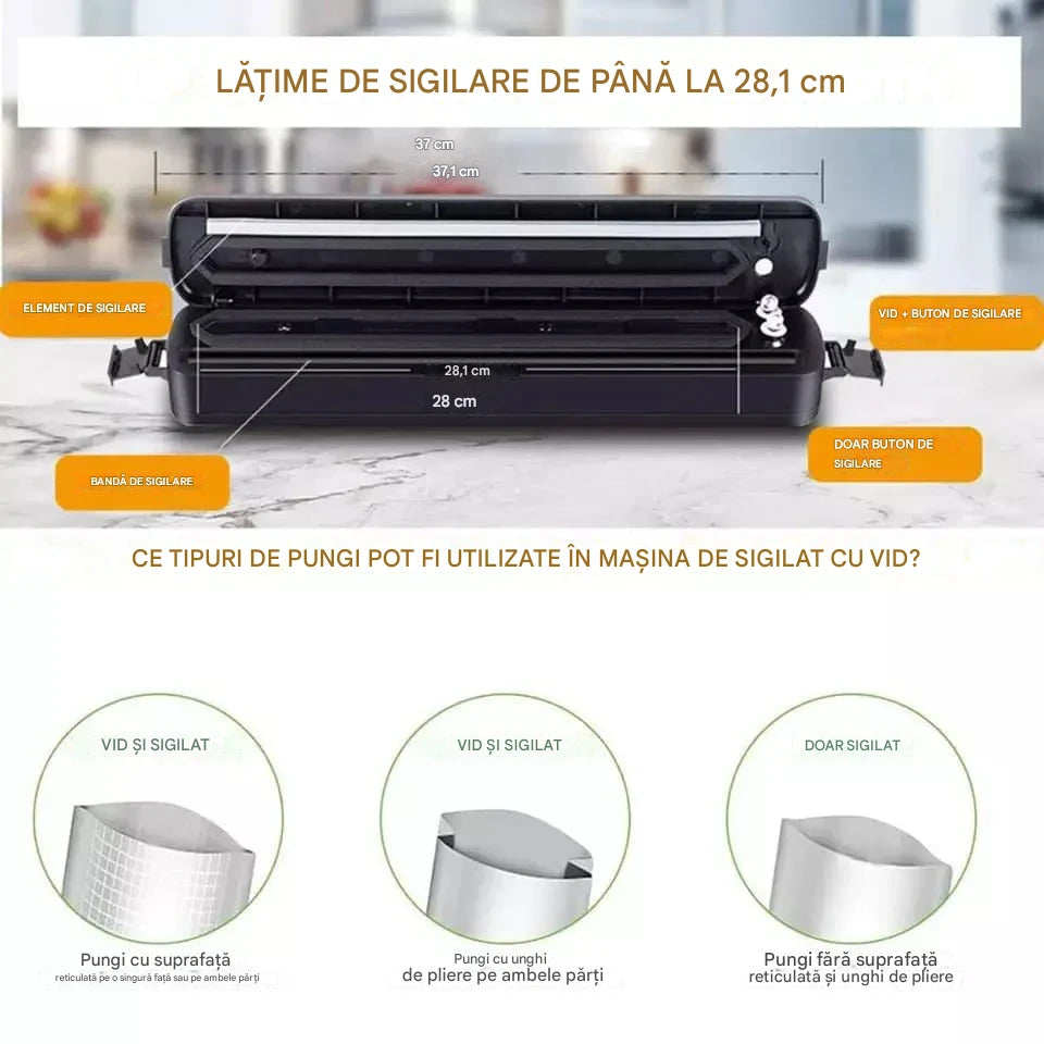 Cu un design intuitiv, Aparatul de Vidat Vacuum Sealer funcționează cu o singură atingere. Introduceți punga, apăsați butonul și lăsați motorul puternic să elimine aerul în câteva secunde. Indicatorul verde vă anunță când procesul este finalizat.