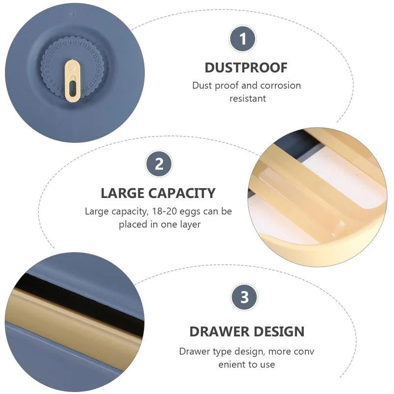 Indicatorul de dată de pe capac vă permite să setați data de păstrare, asigurându-vă că ouăle sunt întotdeauna proaspete. Găurile de ventilație de pe ambele părți ale suportului contribuie la o depozitare pe termen lung.