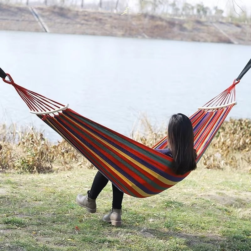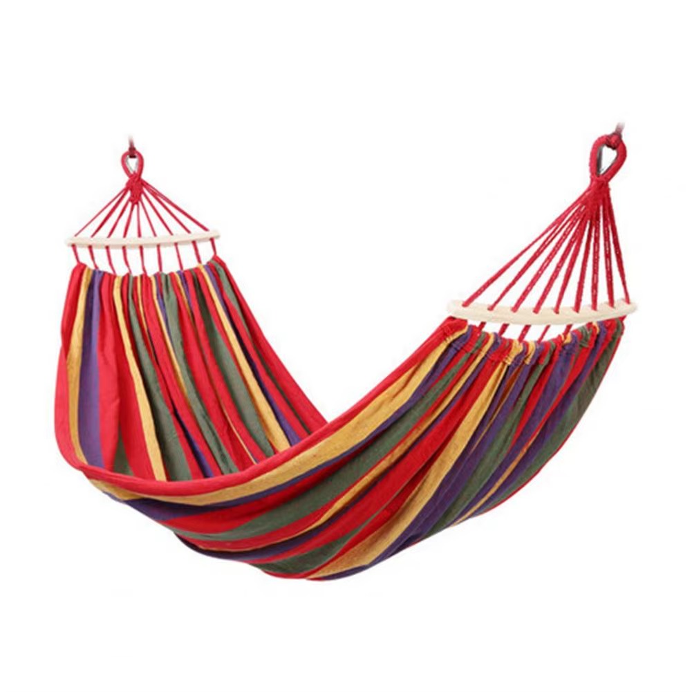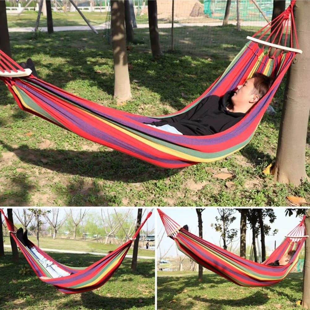 Acest hamac multicolor cu bare din lemn este ideal pentru relaxare în aer liber. Fabricat din bumbac moale și rezistent, oferă un confort sporit și o stabilitate excelentă. Designul său inteligent cu multiple sfori de susținere asigură o distribuție uniformă a greutății, oferind o senzație plăcută de plutire.