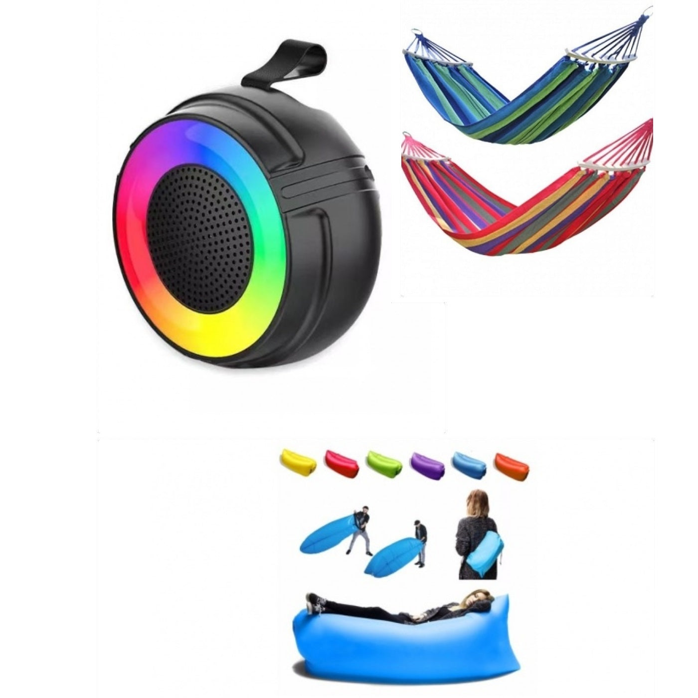 Acest pachet complet, care include un hamac colorat, o saltea gonflabilă și o boxă portabilă, este ideal pentru cei care iubesc să petreacă timp în natură. Fie că sunteți la camping, la plajă sau la un picnic, acest set vă asigură confort, relaxare și distracție.