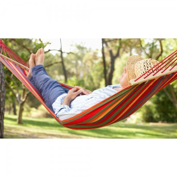 1. Hamac Colorat cu Bare de Lemn: Relaxare și Confort în Natură