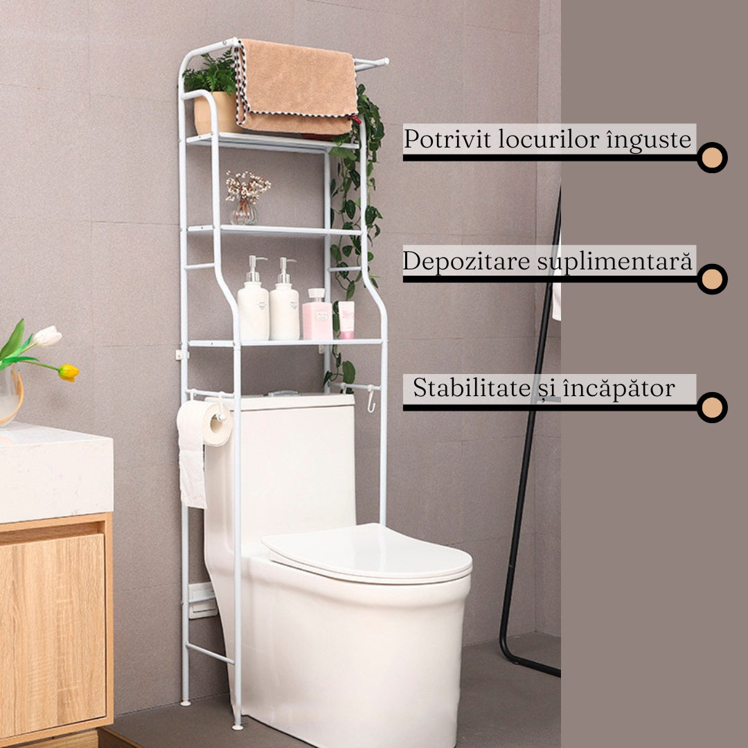 Transformați spațiul neutilizat de deasupra toaletei într-o zonă de depozitare eficientă cu raftul nostru alb metalic. Cu un design inteligent și modern, acest raft de depozitare este perfect pentru a organiza produsele de igienă personală și detergenții, oferind un aspect ordonat și elegant băii dumneavoastră.