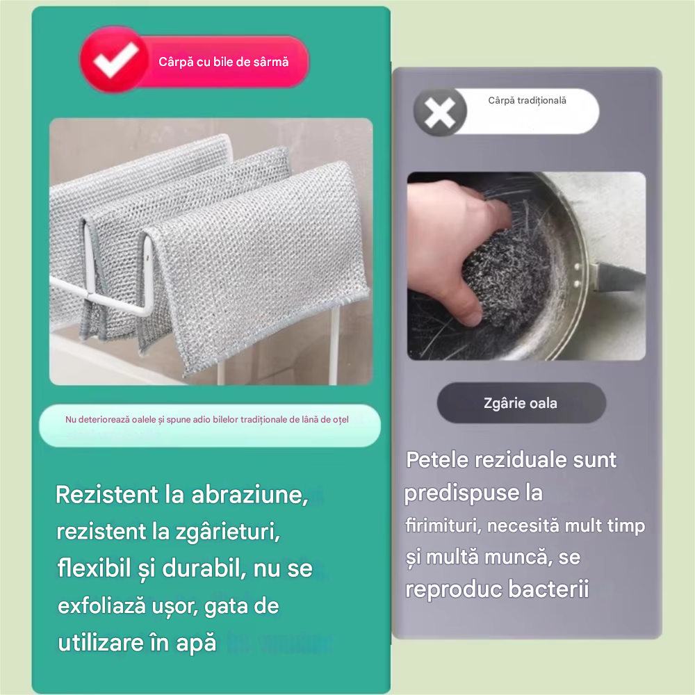 Realizate din microfibra groasa si fir metalic rezistent, lavetele combina performanta de curatare cu durabilitatea. Materialul este ecologic, usor de spalat si refolosibil, asigurand o solutie sustenabila pentru curatenia zilnica. Fiecare laveta are o textura ferma dar sigura pentru suprafete delicate, oferind o curatare eficienta fara detergenti agresivi.