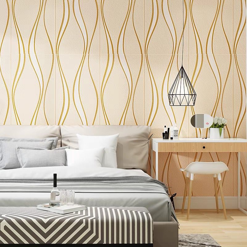 Set 10 x Tapet 3D Autoadeziv cu model bej cu fir auriu si alb, 68 cm x 68 cm x 6mm