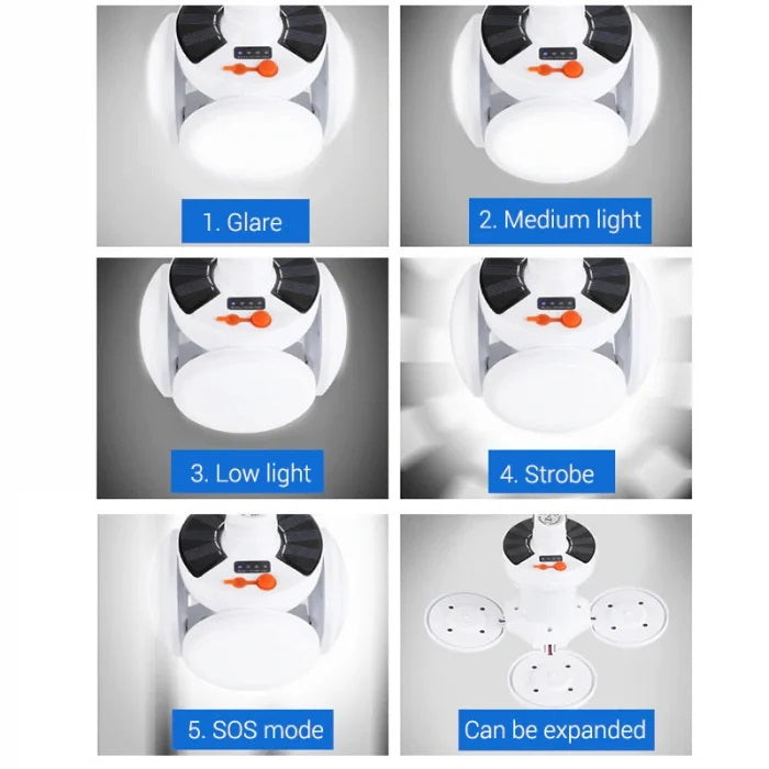 Set 2 x bec cu panou solar si acumulator, 4 brate rabatabile si 5 trepte de iluminat