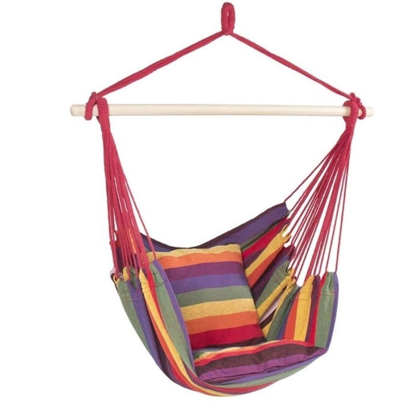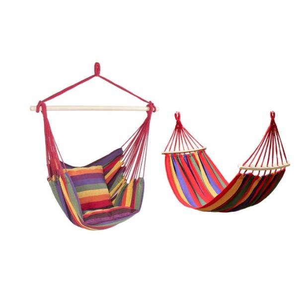 Set 2 x Hamac: Hamac Tip Scaun, cu Bara de Lemn + Hamac Colorat cu Doua Bare din Lemn