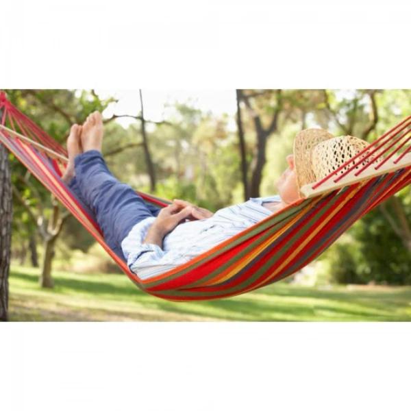 Adăugați un strop de culoare grădinii dumneavoastră cu hamacul colorat, prevăzut cu două bare din lemn pentru susținere. Fabricat din bumbac dens, acest hamac de 80 x 200 cm este rezistent și ușor de transportat, ideal pentru excursii sau camping.