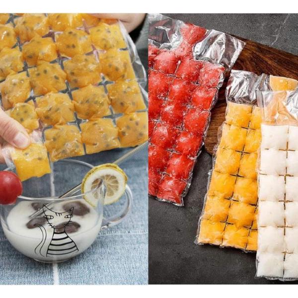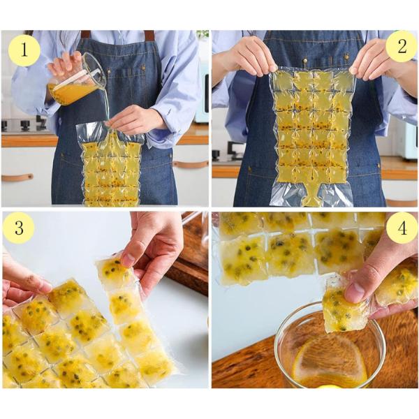Aceste pungi practice sunt ușor de utilizat. Pur și simplu umpleți-le cu apă și legați-le pentru a le sigila înainte de congelare. Pregătirea cuburilor de gheață devine astfel rapidă și convenabilă.