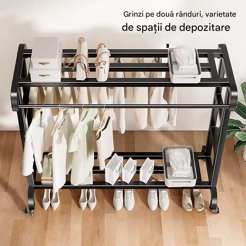 Fabricat din teava groasa de fier, suportul este conceput pentru o utilizare indelungata si rezistenta la deformare. Dispune de raft inferior dedicat pentru pantofi sau bagaje, bara laterala pentru haine lungi si raft superior pentru paturi sau cutii de depozitare. Ideal pentru apartamente, camere de camin sau spatii comerciale, acest model imbina utilitatea practica cu un design minimalist, potrivindu-se perfect in orice decor modern.
