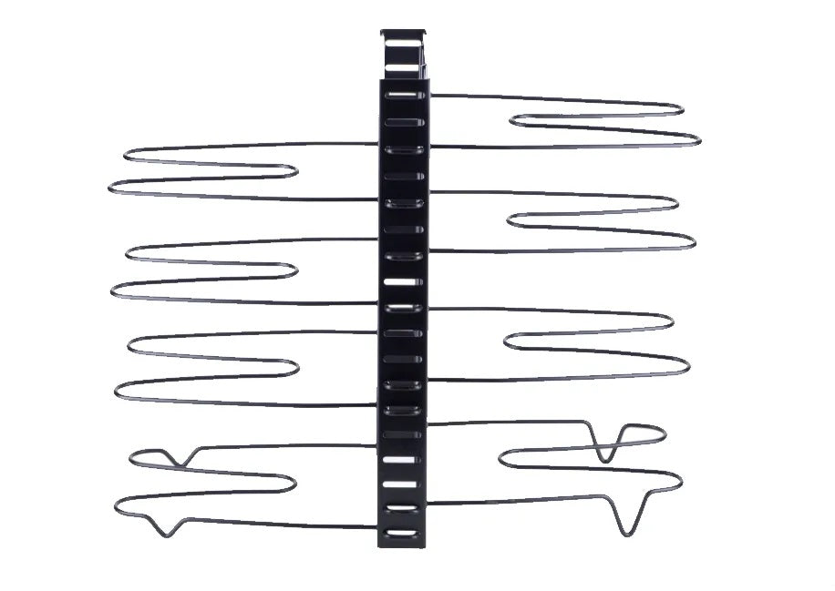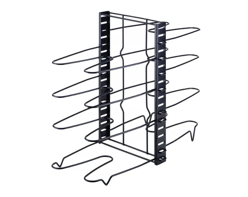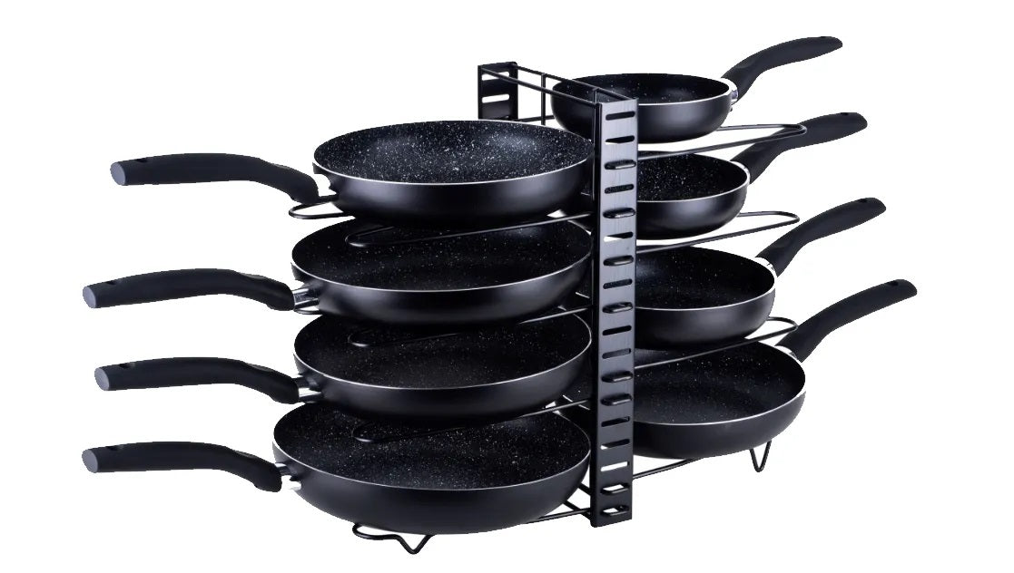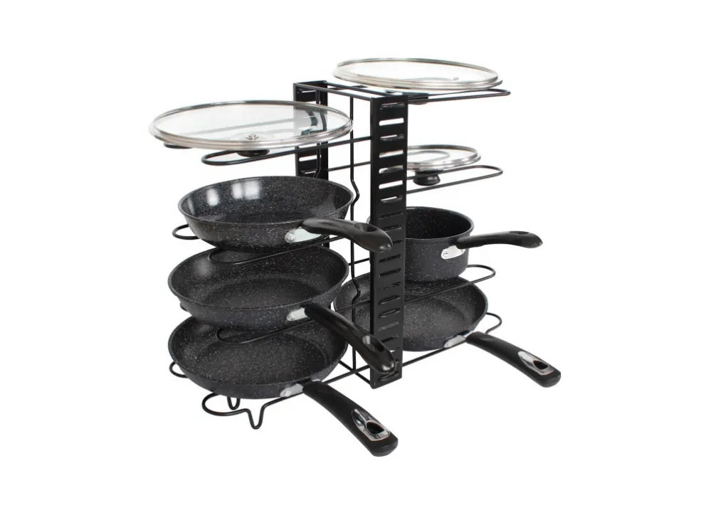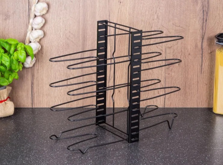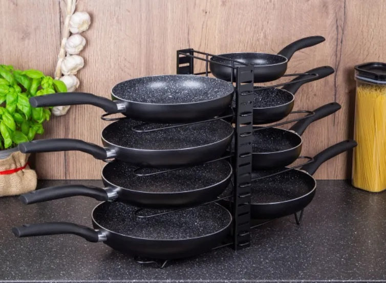 Transformă-ți bucătăria cu suportul organizator pentru tigăi, oale, capace și tocătoare. Cu 8 niveluri reglabile, acest organizator dublu îți permite să depozitezi eficient și să economisești spațiu, păstrându-ți ustensilele la îndemână.
