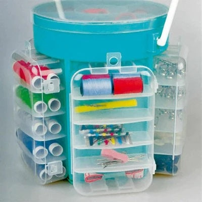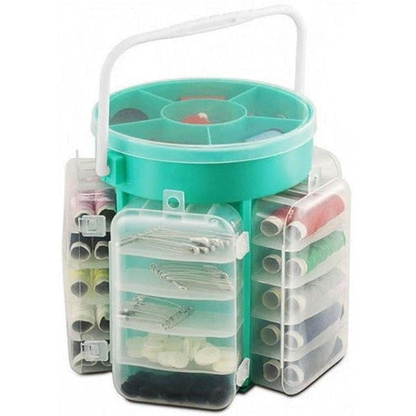 Fiecare accesoriu din trusa de cusut este organizat în compartimente separate, dispuse circular, în formă de turn. Această organizare inteligentă asigură vizibilitate maximă și acces rapid la toate piesele, facilitând orice operațiune de cusut.